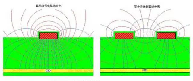 图1-8-16 单端信号和差分信号的地磁场分布示意图