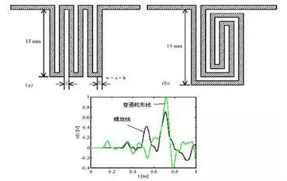 图1-8-21 螺旋走线和普通蛇形线的比较
