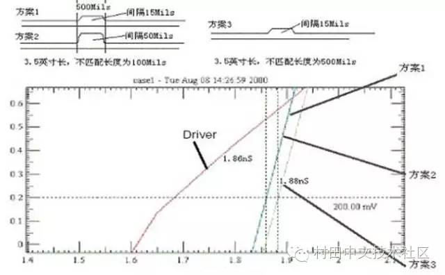 从上面的仿真结果看来,方案 1 和方案 2 波形几乎是重合的,也就是说,间距不等造成的影响是微乎其微的,相比较而言,线长不匹配对时序的影响要大得多(方案3)。再从理论分析来看,间距不一致虽然会导致差分阻抗发生变化,但因为差分对之间的耦合本身就不显著,所以阻抗变化范围也是很小的,通常在10%以内,只相当于一个过孔造成的反射,这对信号传输不会造成明显的影响。而线长一旦不匹配,除了时序上会发生偏移,还给差分信号中引入了共模的成分,降低信号的质量,增加了EMI。