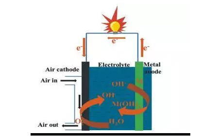 铝空气电池的化学反应与锌空气电池类似,铝空气电池以高纯度铝Al(含铝99.99%)为负极、氧为正极,以氢氧化钾(KOH)或氢氧化钠(NaOH)水溶液为电解质。铝摄取空气中的氧,在电池放电时产生化学反应,铝和氧作用转化为氧化铝。
