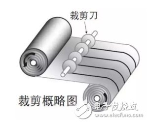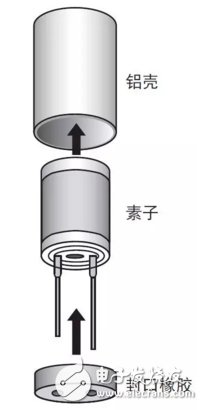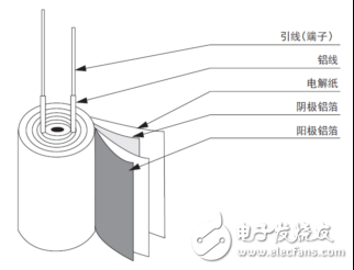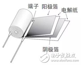 将阴极铝箔和阳极铝箔之间插入电解纸,然后卷绕成圆柱形,在卷绕工艺上阴极箔和阳极箔连接上端子。