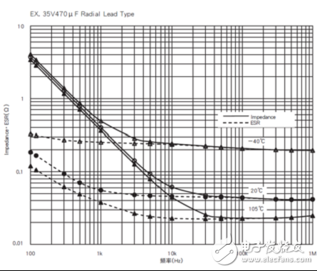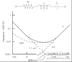 铝电解电容的等效模型有C、R、L组成,电容器两端的频率-阻抗特性也由C、R、L的频率-阻抗特性叠加组成。如图12。1/ωC是容抗,直线向下45°角。ωL是感抗,直线向右上45°角。R代表等效串联电阻。在低频区间,有频率依存的电介质损失影响大,因而R线向下。在高频区间,电解液和电解纸的阻值占主导地位,不在受频率影响,因而R值趋于稳定。