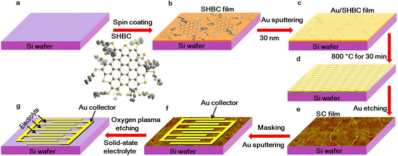 该研究团队利用纳米金薄层的二维纳米限域效应和金催化作用,采用自下而上逐步热解法成功制备出连续、均匀的硫掺杂石墨烯薄膜;以该薄膜为电极,采用微纳加工技术构建微型超级电容器。该电容器具有体积比容量高(582F/cm3)、循环稳定性好和功率密度高(1191W/cm3)等优点。机理研究表明,纳米金薄层的存在有利于形成稳定的S-Au键、C-S键,从而实现了纳米石墨烯主体结构完整、硫元素均匀掺杂和薄膜厚度均一。该工作为自下而上法可控制备大面积、连续石墨烯薄膜提供了新思路;也为硫掺杂石墨烯提供了新方法,并证实了硫掺杂能显著提高石墨烯薄膜的电化学性能。