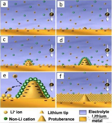 另外一种行之有效的办法是在电解液种添加少量的还原电势稍低于Li+的Cs+和Rb+,研究显示在Cs+和Rb+浓度<0.1mol/L时,当局部形成Li枝晶时,由于较高的电流密度,会吸引Cs+和Rb+,从而在枝晶的表面形成一层带有正电荷的离子层,从而对Li+形成排斥,促使Li+到其他区域沉积,从而阻止锂枝晶的生长。