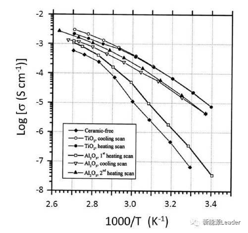 PEO因为低玻璃态转变温度和良好的Li盐溶解性,使其非常适合作为固态电解质适用,但是遗憾的是PEO的离子电导率不高,难以适应大电流放电的需求。PEO低离子电导率主要是因为,其在低温下部分结晶,限制了离子迁移速度,其中一种解决方法是引入共聚物,抑制电解质结晶。另外一种方法是向电解质中添加少量的陶瓷颗粒和层状陶土,或者其他介孔颗粒,这些无机颗粒的作用类似于表面塑化剂,能够减少电解质的结晶。例如向PEO8-LiClO4 (8:1)中加如TiO2和Al2O3,当电解质的温度从60℃下降到常温时,能够很好的抑制电解质从无定形状态向结晶状态转变,从而使得电解质的电导率从5´10-8提高到10-5S/cm,迁移数也提高到了0.5-0.6,如下图所示。