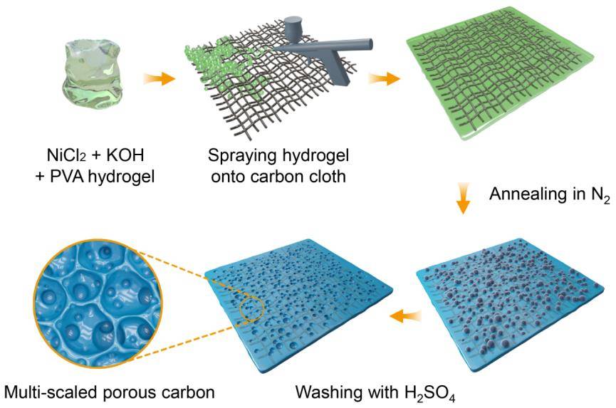 多级孔结构碳电极通过利用NiCl2、KOH与聚乙烯醇的混合水凝胶作为碳的前驱体,使用喷涂法将水凝胶附着于柔性碳布导电基底上,通过于氮气中的高温碳化处理与酸清洗制备。.