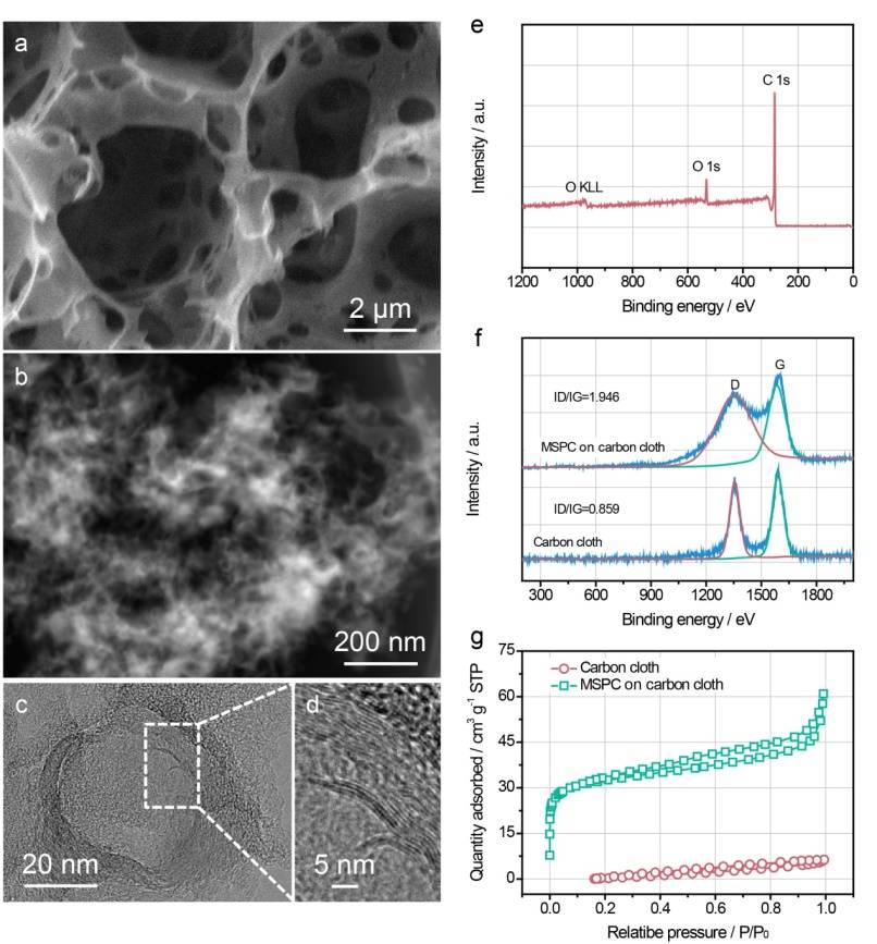 (g) 氮气吸脱附曲线显示制备的碳材料具备微孔、介孔与大孔,形成高比表面积的多级孔结构。