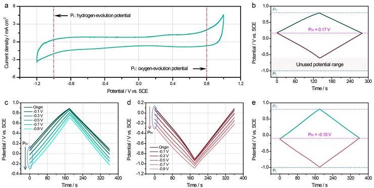 (e) 通过预充电策略改变P0V后,超级电容器正负极同时达到水分解电位,器件电容电位窗口得到最大程度扩展。