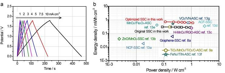 (b) 电位窗口扩展后的超级电容器的能量密度和功率密度,及其与未调控P0V超级电容器和部分已报道的超级电容器对比。