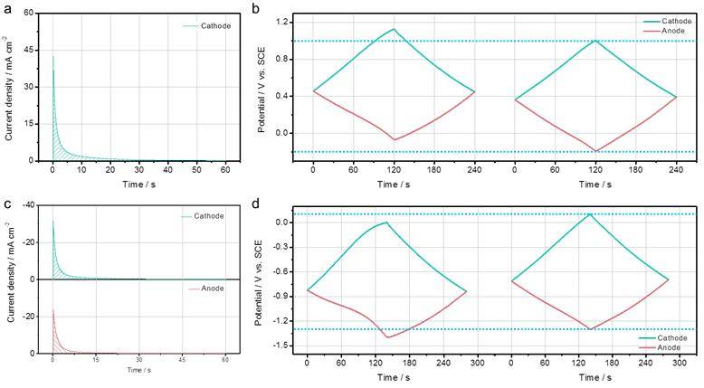 (c-d) 利用不同恒电位对负极进行预充电后,电容器正极(c)和负极(d)的工作电位区间发生负移。