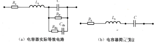 ESR和ESL对电容的高频特性影响最大,所以常用如图1(b)所示的串联RLC简化模型,可以计算出谐振频率和等效阻抗: