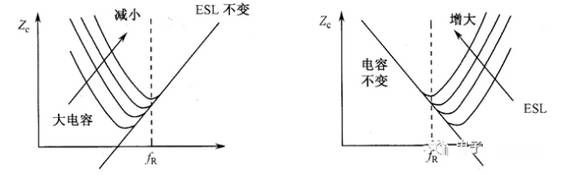 由谐振频率式(4-8)可得出,容值大小和ESL值的变化都会影响电容器的谐振频率,如图3所示。由于电容在谐振点的阻抗最低,所以设计时尽量选用fR和实际工作频率相近的电容。在工作频率变化范围很大的环境中,可以同时考虑一些fR较小的大电容与fR较大的小电容混合使用。