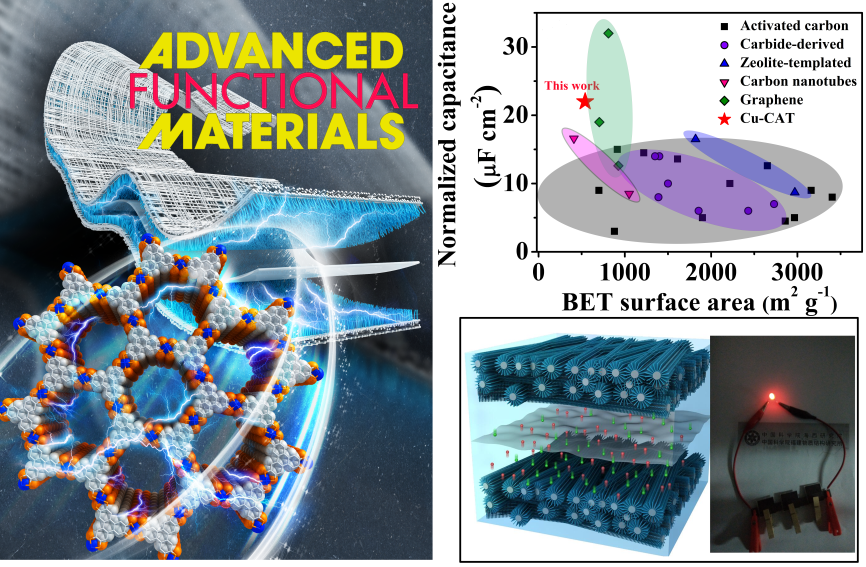 左:文章被选为《先进功能材料》内封面;右:基于导电MOF纳米阵列的固态超级电容的性能及结构图。
