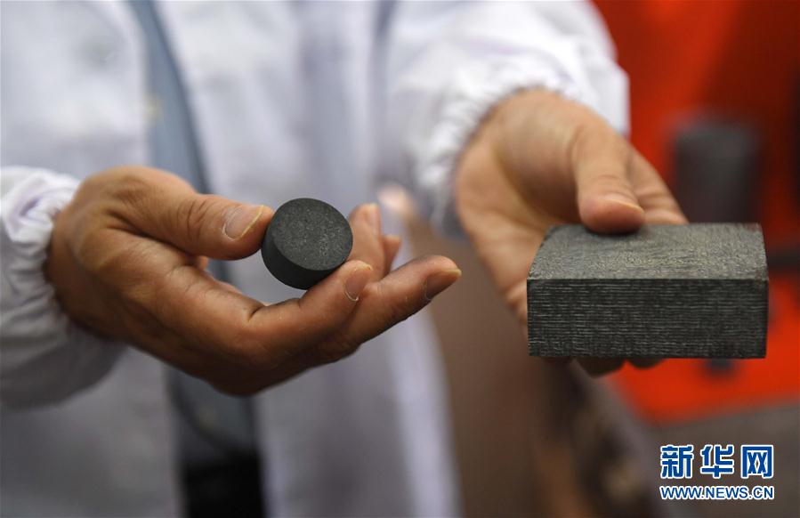 中南大学粉末冶金研究院熊翔教授在展示超高温复合材料坯体(9月16日摄)。记者近日从中南大学获悉,由黄伯云院士领衔的中南大学粉末冶金国家重点实验室团队,通过大量实验开发了一种新型的耐3000摄氏度烧蚀的陶瓷涂层及其复合材料,这一发现有可能为高超声速飞行器的研制铺平道路。9月16日,记者来到这个实验室,现场见证了科研工作者对新型超高温复合材料坯体进行3000摄氏度烧蚀实验。新华社记者 李尕 摄