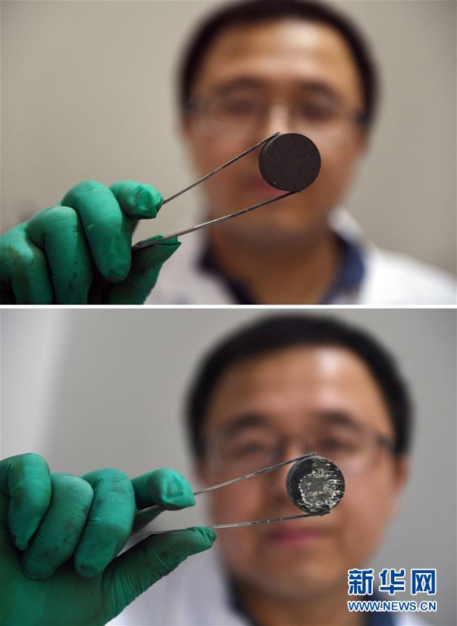 拼版照片:上图为中南大学粉末冶金国家重点实验室研究人员在观察灼烧实验前的超高温复合材料坯体表面;下图为研究人员在观察灼烧实验后的超高温复合材料坯体表面(9月16日摄)。记者近日从中南大学获悉,由黄伯云院士领衔的中南大学粉末冶金国家重点实验室团队,通过大量实验开发了一种新型的耐3000摄氏度烧蚀的陶瓷涂层及其复合材料,这一发现有可能为高超声速飞行器的研制铺平道路。9月16日,记者来到这个实验室,现场见证了科研工作者对新型超高温复合材料坯体进行3000摄氏度烧蚀实验。新华社记者 李尕 摄