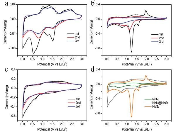 (d)Ni3N,Ni3N@Ni3S2,Ni3S2首圈CV曲线对比。