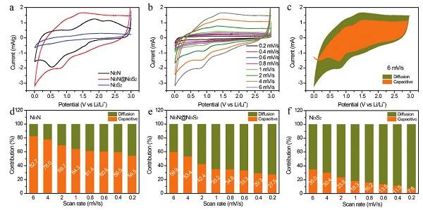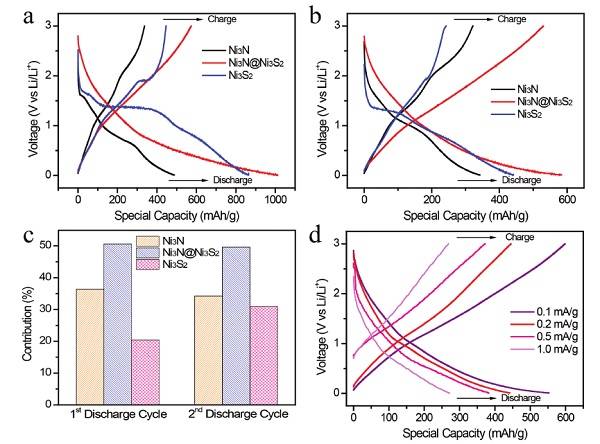 导读:研究发现:Ni3N和Ni3S2之间的相边界是导致复合材料高储锂容量的关键因素。Ni3N较为出色的赝电容特性和Ni3S2较为理想的扩散控制型容量形成协同效应,共同提升了复合材料的电化学储能性能。通过界面失配和赝电容特性和结合,研究人员为未来高性能电化学储能器件的设计提供了新的思路参考。
