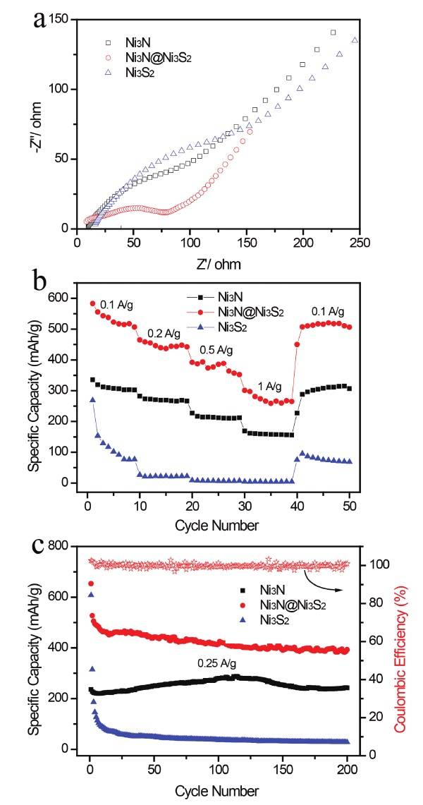 (b)Ni3N,Ni3N@Ni3S2,Ni3S2的倍率性能;