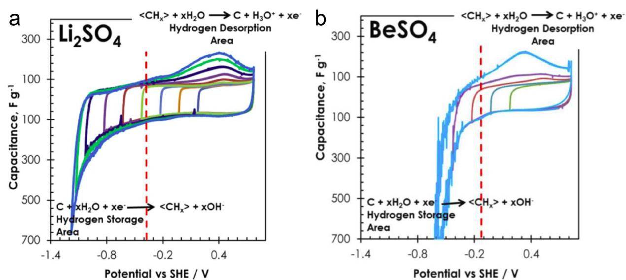 图1. 活性炭电极在(a)Li2SO4(pH=6.5)与(b)BeSO4(pH=2.1)电解液中不同电位范围下测得的循环伏安(CV)曲线。图中红色虚线标示了HER反应的电位。当电极电位低于红色虚线后,CV曲线出现明显的氢离子脱附峰,使得电极偏离电容行为。另外,当pH减小时HER电位相应朝正电位方向移动。图片来自文献[2]。
