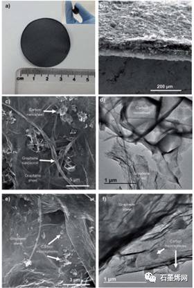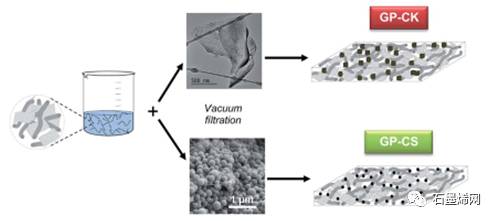 Fig. 1 (a) HGP纸 (GP-CK) 的数字图像,(b) HGP (GP-CS) 的横截面图,GP-CK薄膜的 (c) SEM和 (d) TEM图,GP-CS薄膜的 (e) SEM和 (f) TEM图。