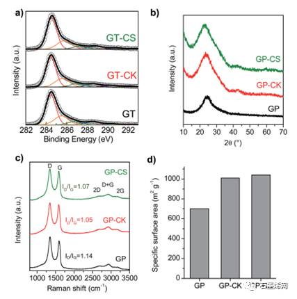 Fig. 2 (a) C 1s轨道的XPS 光谱图,(b) XRD图谱,(c) 拉曼光谱和 (d) GP,GP-CK和GP-CS纸的比表面积。