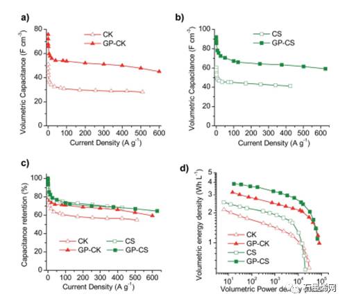 Fig. 3 (a) CK、GP-CK样品,和 (b) CS、GP-CS样品的体积电容随电流密度的变化;对于单位体积CK、GP-CK、CS和GP-CS的(c) 电容保持和 (d) Ragone-like曲线。电解质:1M H2SO4。