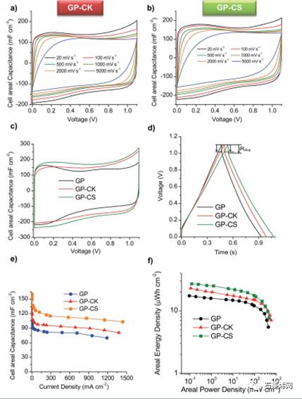Fig. 4 (a) GP-CK和 (b) GP-CS纸在不同扫速下的循环伏安图,(c) 不同石墨烯纸在5 mV s-1扫速下的循环伏安图,(d) 在〜230 mA cm-2 时的恒电流充放循环,(e) 面积电容随电流密度的变化曲线,(f) GP、GP-CK和GP-CS纸的Ragone-like曲线。电解质:1M H2SO4。