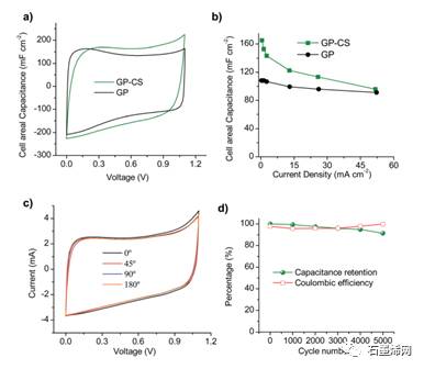Fig. 5 固态超级电容器的性能(电解质:H2SO4-PVA):(a) 在扫速为20 mV s-1时的循环伏安图;(b) 基于GP和GP-CS超级电容器的倍率性能;(c) 扫速为5 mV s-1,不同弯曲角度下的循环伏安图;(d) 180°弯曲状态下,GP-CS超级电容器在13 mA cm-2的恒定电流下通过充放电循环评估的库仑效率和长期稳定性。