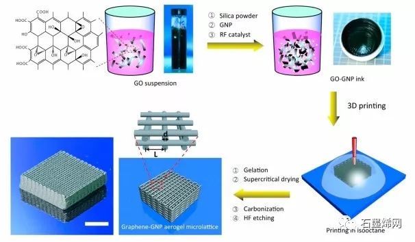 石墨烯是一种原子级的薄二维(2D)碳材料,具有低密度、优越的机械性能、热稳定性、大表面积和优异的导电性等特点。最近的进展已经导致石墨烯的宏观组装,例如用于各种应用的块状石墨烯气凝胶等。然而,由于单重组成和曲折的随机多孔网络,这些三维(3D)石墨烯与其2D结构单元相比表现出物理化学性质衰减。这些限制可以通过开发具有工程化多孔结构的石墨烯复合材料来抵消。在这里,我们通过称为直接墨水书写的3D打印技术报告用于超级电容器应用的3D周期性石墨烯复合气凝胶微晶格的制造。开发这些新型气凝胶的关键因素是创造一种可挤压的石墨烯氧化物基复合油墨和修改3D打印方法,以适应气凝胶处理。3D打印的石墨烯复合气凝胶(3D-GCA)电极重量轻、导电性高,并具有优异的电化学性能。尤其是使用这些厚度在毫米量级的3DGCA电极的超级电容器显示异常的容量(从0.5到10A·g-1约90%)和功率密度(> 4kW·kg-1),这超过了用电极10-100倍稀释的器件。这项工作提供了一个例子,说明如石墨烯气凝胶等3D打印材料如何显著扩大设计空间,以制造高性能和完全可集成的储能器件应用。
