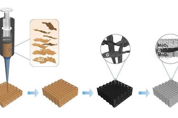 “虽然3D打印石墨烯气凝胶体积比电容(low volumetric capacitance)较低,但是我们成功通过向疏松多孔的石墨烯碳架内注入更多纳米材料的方式增大了它的密度,进而达到提升性能的目的,”Li教授说到,“我们的3D打印石墨烯气凝胶/二氧化锰电极(3D-printed graphene aerogel/MnO2 electrodes)的体积比电容性能相比传统纯石墨烯气凝胶电极(pure graphene aerogel electrodes)提升了数百倍。”按照Li的说法,他们制成的这些质量负载性能比之前学术杂志报道过的提升了大约2到3个量级。